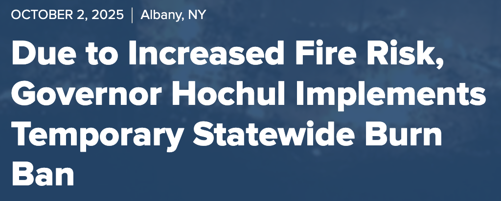 Governor Kathy Hochul, with the New York State Department of Environmental Conservation, today announced a statewide burn ban in effect starting today, October 2 due to increased fire risk and continued dry conditions. The ban will be in effect for 14 days from Oct. 2 to Oct. 15 and will be revaluated prior to expiration. New Yorkers can help prevent fires in communities and in the backcountry by complying with the prohibition on most outdoor fires and protect water supplies by continuing to conserve water whenever possible.